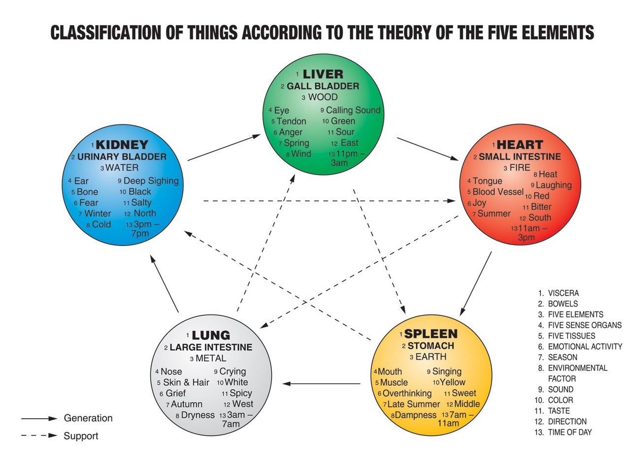The Five Elements are a comprehensive template that organizes all natural phenomena into five master groups or patterns in nature. Each of the five groups Wood, Fire, Earth, Metal, and Water include categories such as a season, a direction, climate, stage of growth and development, internal organ, body tissue, emotion, aspect of the soul, taste, color, sound . . . the categories are seemingly limitless. The Five Elements reflect a deep understanding of natural law, the Universal order underlying all things in our world.